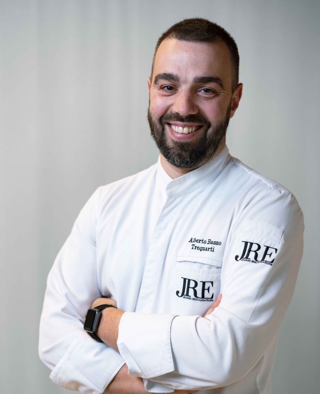 Geboren 1984, hat Chef Alberto Basso in der Portinaria Kochschule gelernt, die Teil des 2 Michelin-Sternerestaurants La Peca ist. 2 Dinge sind wirklich wichtig für ihn: Das sinnliche Vergnügen und die Kreation von stimmigen Gerichte mit ausgeprägten Texturen. Er möchte die volle Fülle des Geschmacks erlebbar machen. In seiner kreativen Küche verarbeitet Chef Alberto viele regionale Produkte, aber ist auch immer auf der Suche nach den besten Zutaten aus ganz Italien. Im Restaurant TreQuarti kombiniert Chef Alberto traditionelle Elemente mit modernen und effizienten Kochmethoden, er überdenkt jedes Gericht auf moderne Art und Weise. Das Ergebnis sind Gerichte, die aus einfachen Hauptkomponenten bestehen, die in eine verspielte Hülle aus Kontrasten und exquisiten Sensationen verpackt sind.