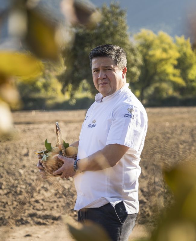 Chef Leonel Díaz stammt aus dem Colchagua-Tal, und seine Küche im Clos Apalta Restaurant beginnt bei den Zutaten der Region. Ein großer Teil des Menüs kommt aus dem Gemüsegarten des Weinguts, ergänzt durch Produkte vom Bauernmarkt in Santa Cruz und von kleinen Erzeugern aus der Umgebung. Sein Stil ist im Geschmack klar lokal verankert und in der Technik souverän, mit französischem Einfluss, der sich in Aufbau und Finish jedes Gerichts zeigt. Gäste können ihn zudem auf den Markt begleiten, gemeinsam Zutaten auswählen und diese anschließend in der Küche zusammen zubereiten.
