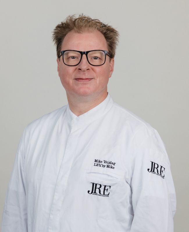 Eigentümer und Chef Mike Vrijdag`s Leidenschaft fürs Kochen startete mit seinem Entschluss, einen Bäckerlehrgang zu machen. Er wollte mehr und entschloss sich, eine Ausbildung zum Koch zu absolvieren. Während seiner Ausbildung im Restaurant De Leeuw in Lichtenvoorde, lernte er, dass dies lange und harte Arbeit sein kann. Danach ging er ins Hotel Frerikshof in Winterswijk und Het Koetshuis in Bennekom, wo Mike feststellte, dass es neben großer Motivation auch viel Leidenschaft bedarf, um den Beruf Koch ausüben zu können. Im Princess Juliana in Valkenburg, seinem ersten Arbeitsplatz mit 2 Michelin-Sternen, wurde er schnell vom Auszubildenden zum Chef de Partie. Danach bewarb er sich im De Bokkedoorns, wo er ebenfalls Chef de Partie wurde. Dann wollte Mike zurück in den Osten und wurde im Restaurant Het Koetshuis Souschef. Kontinuität und Qualität sind die Eckpfeiler seiner Position, die mit einem prestigreichen Michelin-Stern ausgezeichnet wurde. 2011 eröffnete Chef Mike Vrijdag die Türen des Restaurants Strandlodge, das 2015 mit einem Michelin-Stern ausgezeichnet wurde. 2020 entschloss Mike, die Dinge zu ändern und verwandelte die Strandlodge in das heutige Restaurant: LEV. by Mike.