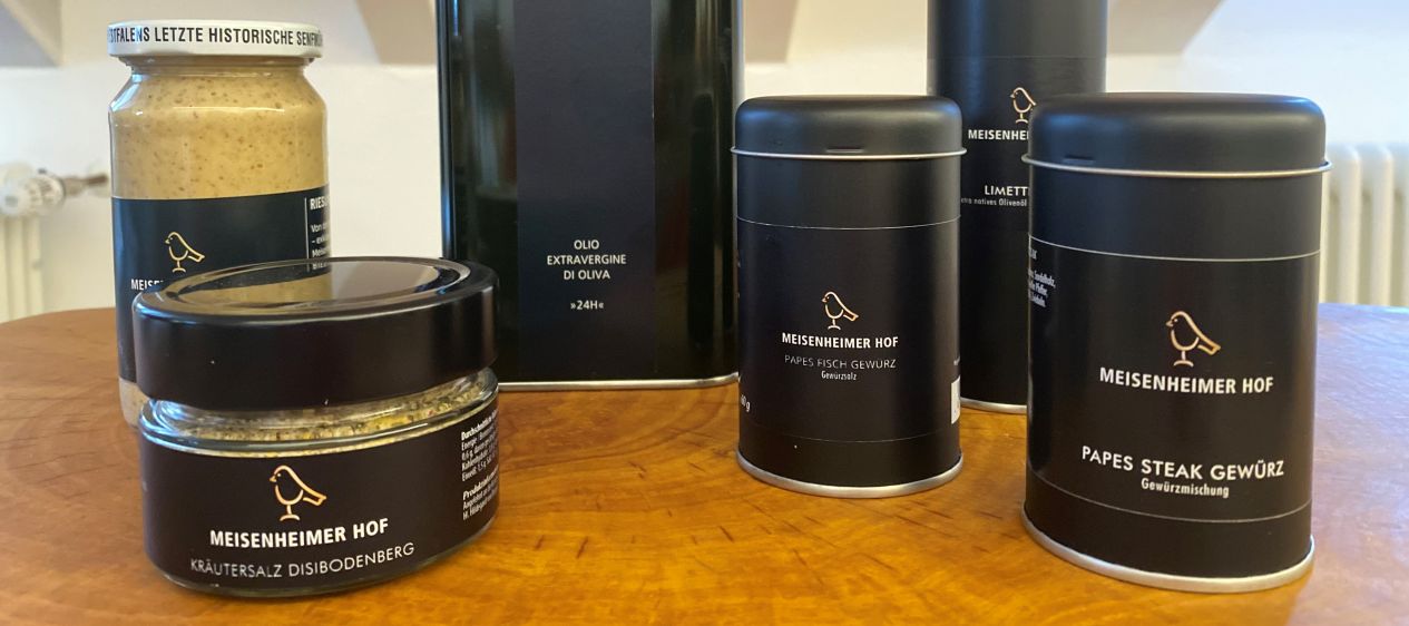 Der Geschmack des Meisenheimer Hofes hält so Einzug in die heimische Küche. Hergestellt werden unsere Produkte aus besten Zutaten mit Hilfe kleiner, ausgewählter Manufakturen: Unser Olivenöl erzeugen wir beispielsweise exklusiv mit der Azienda Agricola L'arcobaleno. Die Besonderheit unseres Verfahrens liegt dabei in der kurzen Zeit von "24h", die zwischen Ernte und dem fertig gepressten Öl liegt.
