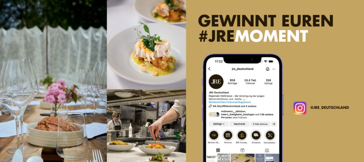 Die Jeunes Restaurateurs Deutschland (JRE) laden alle Feinschmeckerinnen und Feinschmecker ein, vom 29. April bis zum 13. Mai 2025 an einem exklusiven Gewinnspiel auf Instagram teilzunehmen. Insgesamt drei Gewinnerinnen oder Gewinner haben die Möglichkeit, gemeinsam mit einer Begleitperson einen unvergesslichen Tag mit einer Spitzenköchin bzw. einem Spitzenkoch aus den Reihen der JRE-Deutschland zu verbringen.