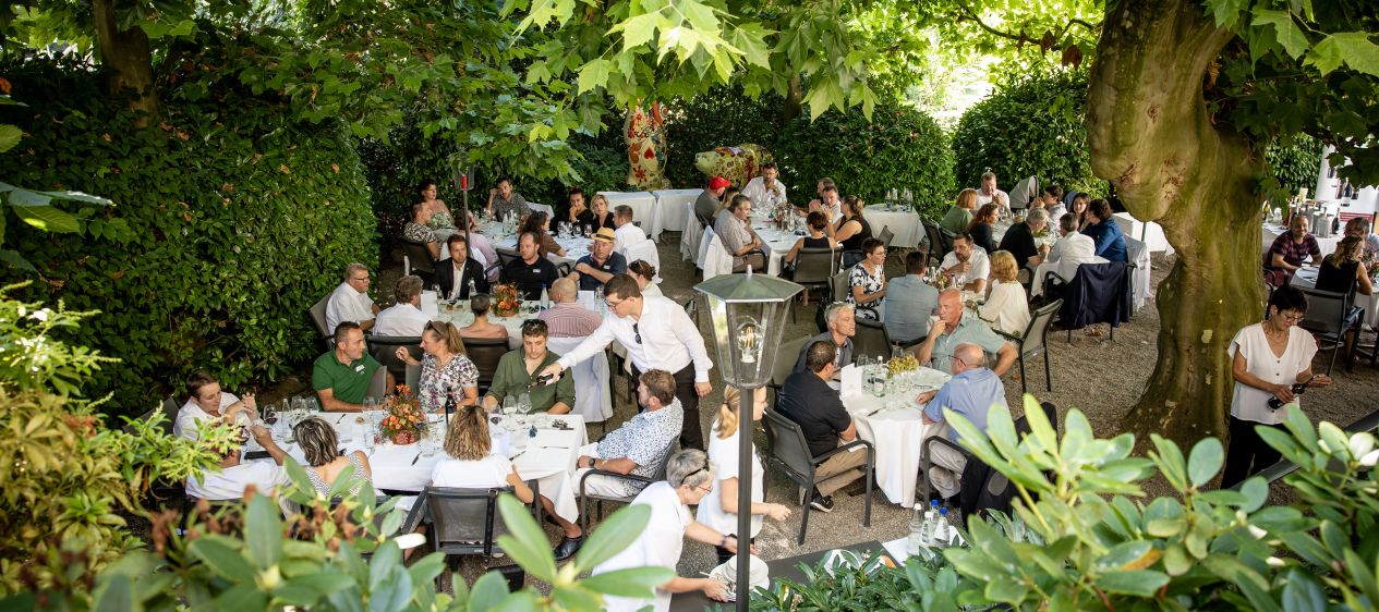 APFELKUCHEN ZUM ABSCHIED. Nach sechs Jahren als JRE-Präsident tritt Martin Thommen zurück und lud aus diesem Anlass die Mitglieder zu sich in den «Bären» nach Utzenstorf ein. Zum Lunch verwöhnte er mit seinen Signature Dishes: Eine Variation der berühmten Utzenstorfer Bachforelle, einem schön rosa Swiss Black Angus Beef mit Züpfen-Knödel, gefolgt vom noch berühmteren Apfelkuchen mit dem hauchfeinen Teig, den Mutter Margret Thommen nach dem hundertjährigen Familienrezept immer noch selbst knetet. Kuchen um Kuchen wurde frisch aus dem Ofen in den Garten getragen und dort von Margret und Manuela Thommen geschnitten und verteilt. Die Jeunes Restaurateurs griffen begeistert zu. Die Lebensgeister, die am späteren Morgen nach einer langen Nacht teilweise noch etwas betäubt waren, regten sich zusehends. Die legendäre Party am Vorabend gehört zur GV, wie das Amen in der Kirche. Gefeiert wurde bis gegen fünf Uhr morgens. Höhepunkt im Abschiedsmenü vom Sonntagabend: Martin Thommen bereitete zwei gewaltige Kalbsrücken am Stück zu, mit Carrée, Filet und Knochen! «Auf den Punkt gebraten», sagt der Luzerner 16-Punktechef Beat Stofer, «schwierig und grossartig.»