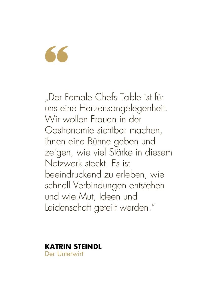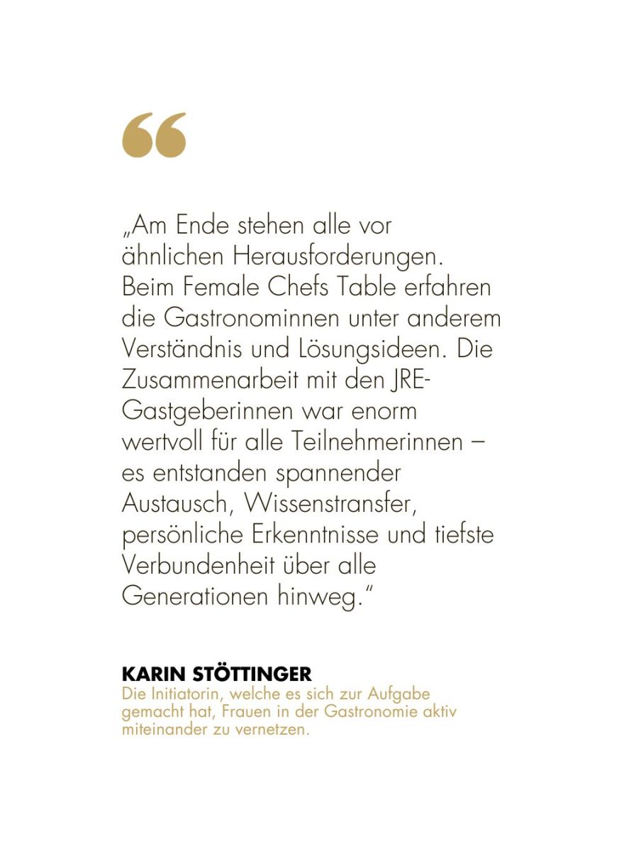 Gastgeberinnen des Events waren Katrin und Sabrina Steindl, die den einzigen rein weiblich geführten JRE-Betrieb Österreichs leiten und die Bedeutung weiblicher Vorbilder in der Kulinarik repräsentiert, und Karin Stöttinger, Gründerin der Plattform Female Chefs.