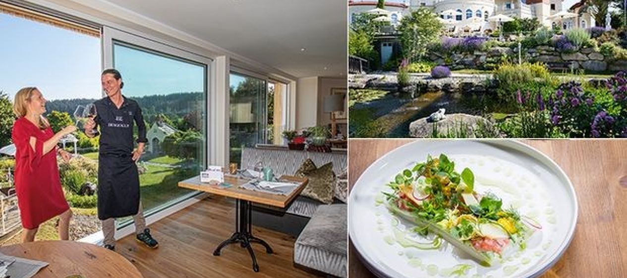 Fantastische Ausblicke auf die liebliche Hügellandschaft mit den typischen Steinbloß-Vierkanthöfen und den bunten Streuobstwiesen begleiten ab sofort das Kulinarik-Programm im Bergergut. Dank des aufwändigen Restaurant-Umbaus samt Panoramafenstern und stilvoll, kuscheligem Interieur dient der Blick in die Naturlandschaft als Unterhaltungsprogramm in 4D. 2-Haubenkoch Thomas Hofer führt kulinarisch durch den Abend.