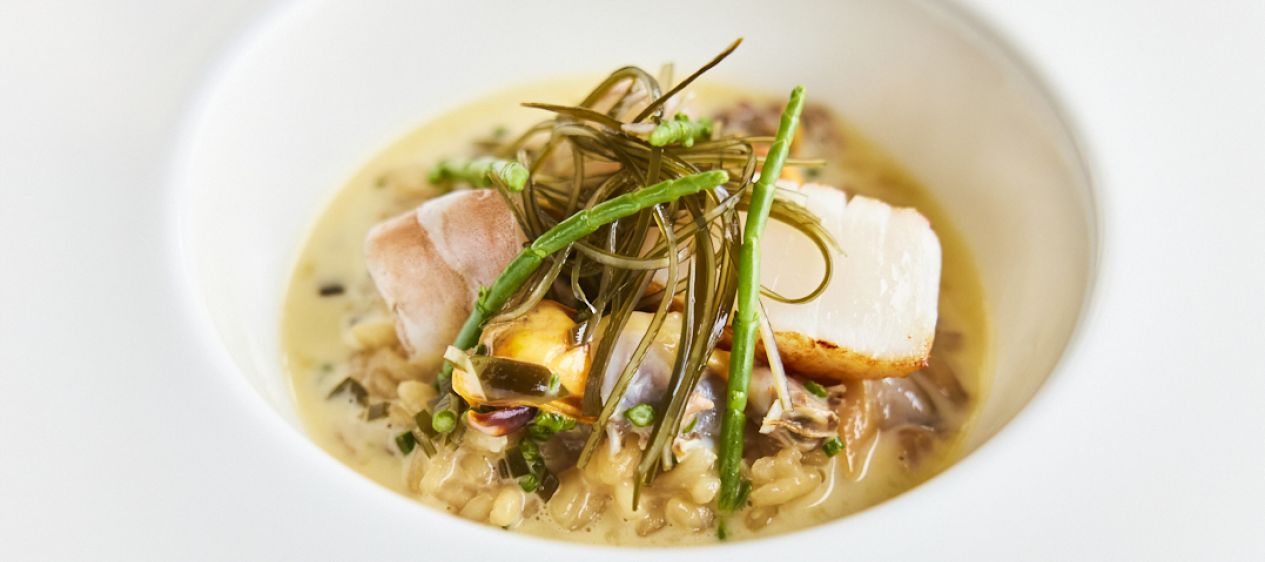 Die Schalotten grob schneiden, zusammen mit dem Dashi-Fond, dem Lorbeerblatt und den Pfefferkörnern aufkochen und die Flüssigkeit auf 250 ml einreduzieren. Durch ein feines Sieb abpassieren und dabei die Schalotten kräftig ausdrücken. Anschließend den Fond mit 150 g fein gewürfelter kalter Butter aufmontieren. ANRICHTEN Die gewürfelten Jakobsmuscheln und die Miesmuscheln zusammen mit den Salicornes und Kombu-Algen im Risotto erwärmen, die marinierten Fjordshrimps auf das Risotto setzen und die Dashi Beurre Blanc um das Risotto herum angießen.