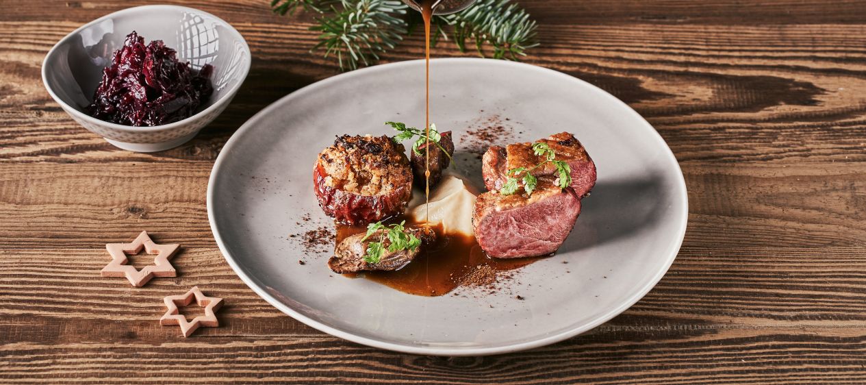 Entenbrust, Rotkohl, Selleriepüree, Entenleber und Bratapfel
