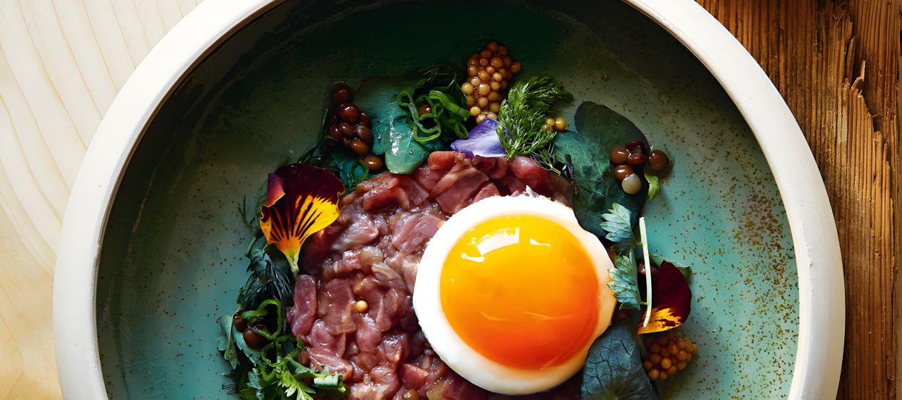 Vorspeise: Rindertatar „Alb.sty­le“ mit schwäbischem Kaviar, Wachtelei und Kräutersalat