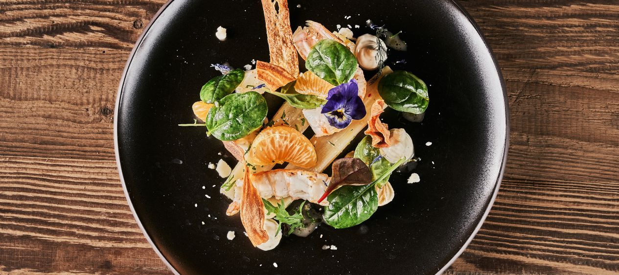 Kaisergranat, eingelegte Schwarzwurzeln, Mandarine, Spinatsalat und Gewürz-Mayonnaise