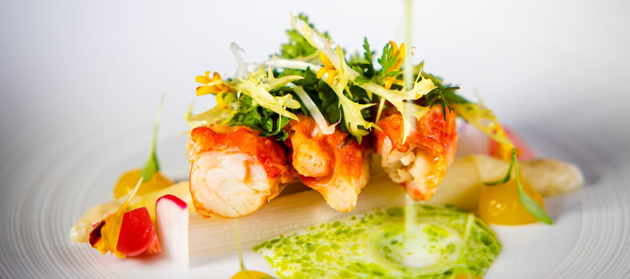 Die flüssige Nussbutter in einer Sauteuse auf ca.60 Grad erwärmen, darin die Kingcrabstücke erwärmen für ca.2Min. per Seite. In der Zwischenzeit den Spargel auf vier Tellern mittig anrichten. Die Salattriebe mit Reisessig, Öl & Salz lecker & leicht abschmecken. Nun die Kingcrabstücke kurz auf Crepepapier abtropfen lassen, mit Fleur de Sel würzen und auf den Spargel legen. Den Salat mittig obenauf setzen, mit Kresse, Blüten & Radieschen garnieren. Zu guter Letzt den Buttermilchsud mit 3-4 EL Schnittlauchöl vorsichtig mit einem Löffel verrühren. Diesen Sud an das Gericht gießen & servieren………………….Viel Spaß!