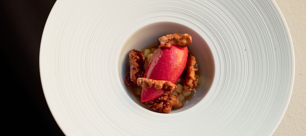 Rotkohlsorbet mit Apfelkompott und karamellisierten Walnüssen