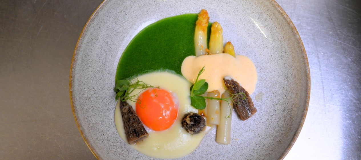 Stundenei 63°C | Spargel | Ahornsirup | Morcheln | Erbsensud | Hollandaise | Kartoffeln