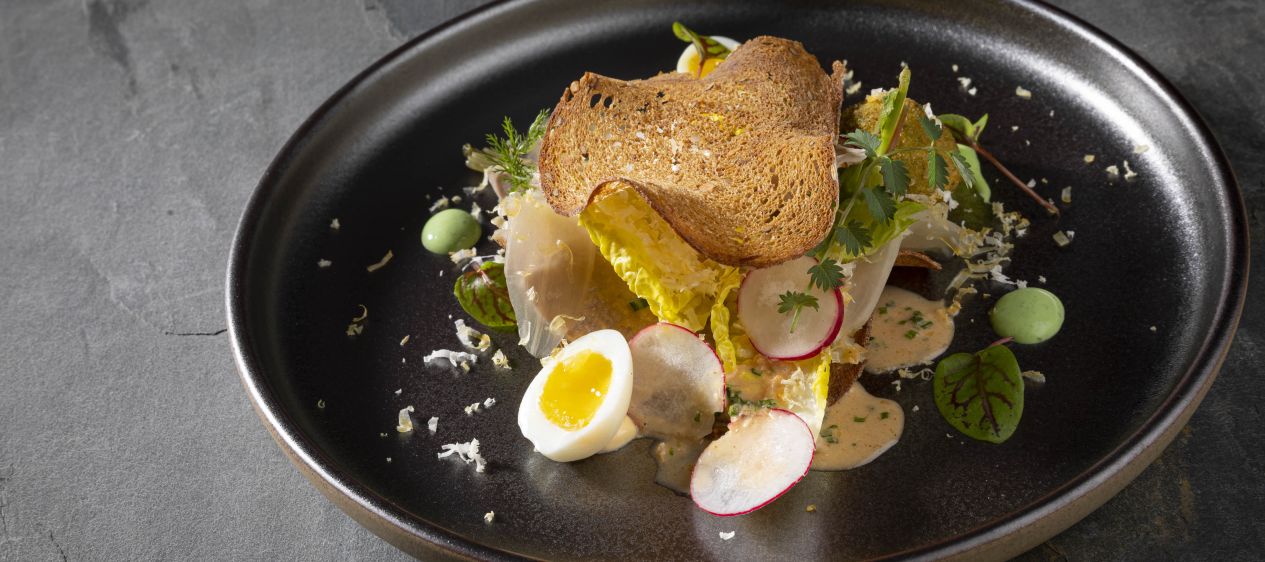 Die Radieschen dekorativ darauf anrichten. Schließlich das Zockerbrot mit einigen Kopfsalatblättern und einem halben Wachtelei garnieren. Direkt das Zockerbrot mit frisch gerissenem Kren, groben Meersalz und geriebenen gebeizten Eigelb verfeinern. Einen zweiten Brotchip aufsetzen. Schließlich einige Tropfen von beiden Saucen neben das Zockerbrot geben. Die frisch gebackene Praline noch aufsetzen und mit Kerbel, Radieschen und Rettichstreifen dekorieren.