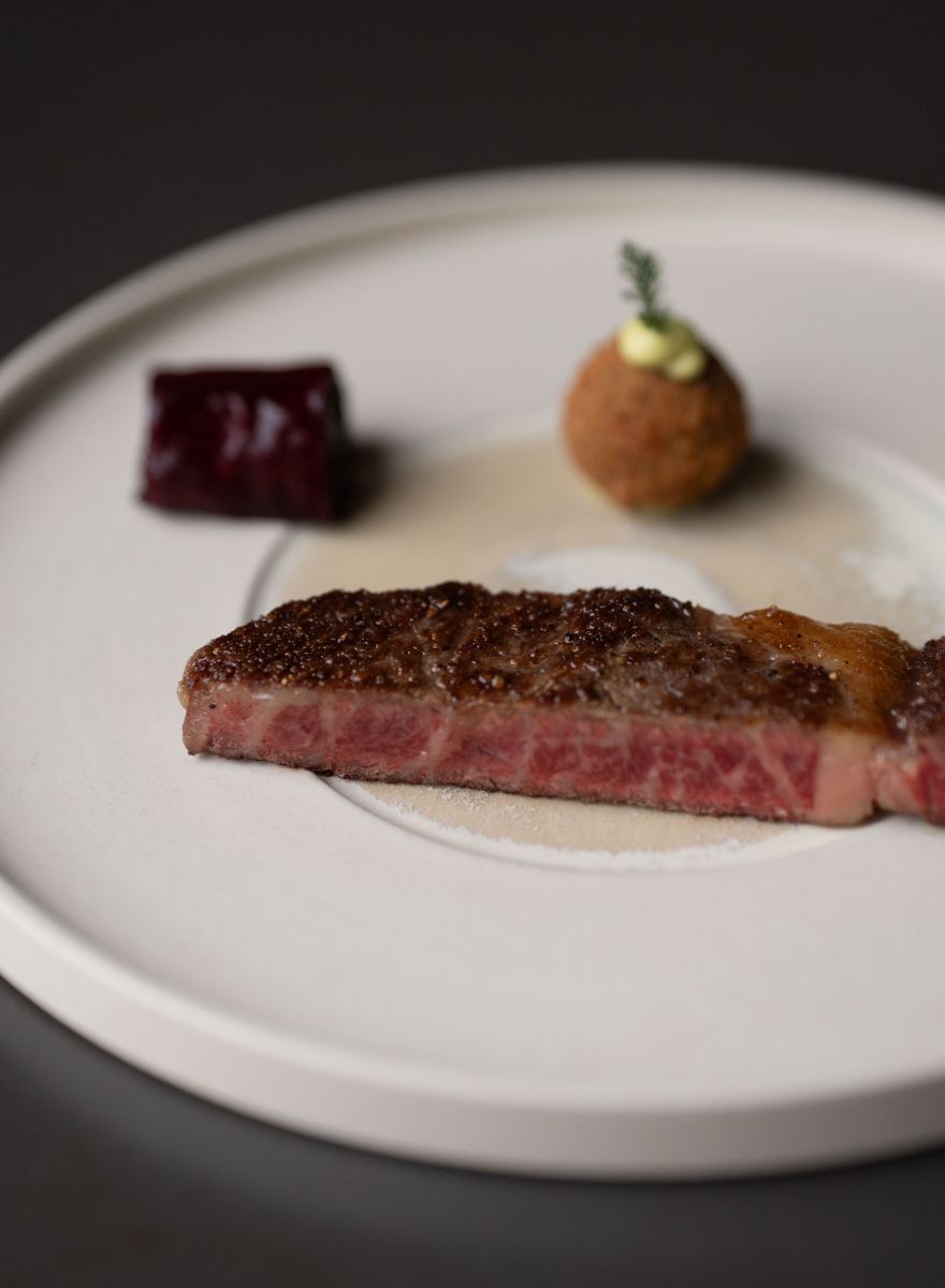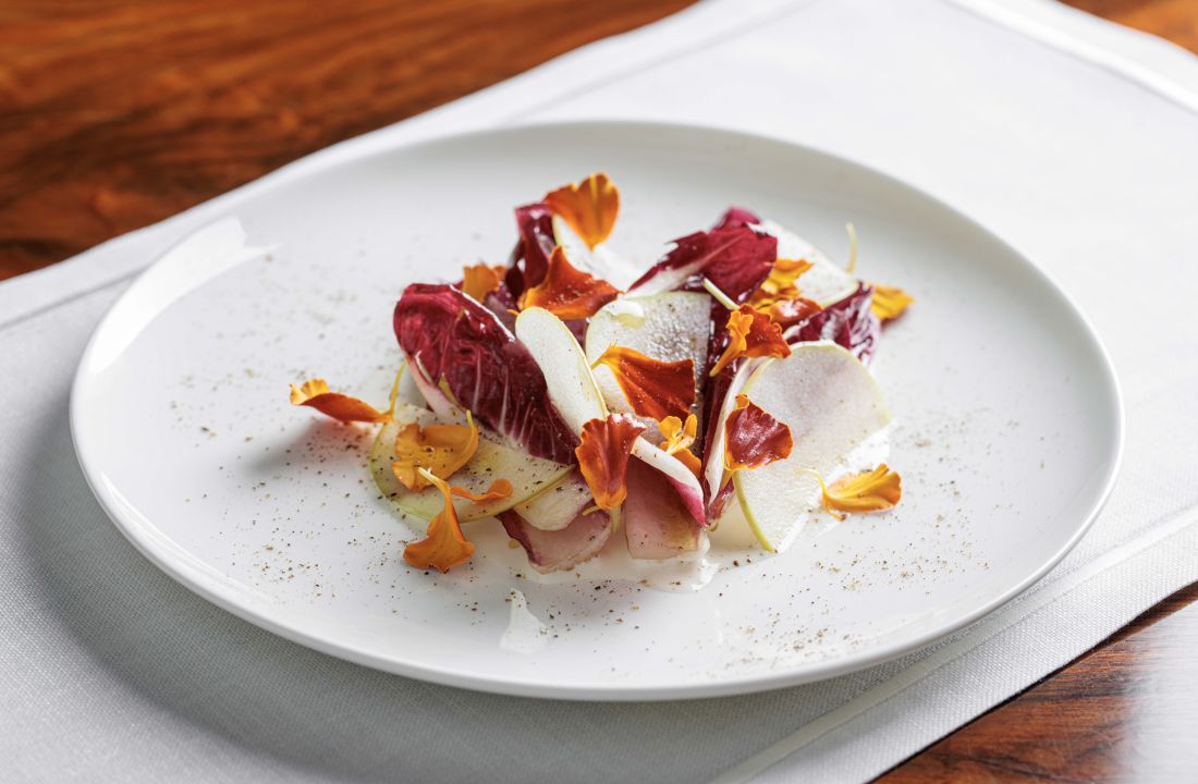 At the heart of the dish is red endive, whose gentle bitterness sets the tone for a layered interplay of flavours. Crisp green apple and citrus bring freshness, while a silky walnut and Mozzarella di Bufala sauce adds richness and depth. A walnut praline introduces subtle caramel notes and texture, and aromatic accents of orange blossom water and Timut pepper provide lift. The result is a composed salad that moves between freshness and creaminess, tension and harmony, delivering clarity in every bite.