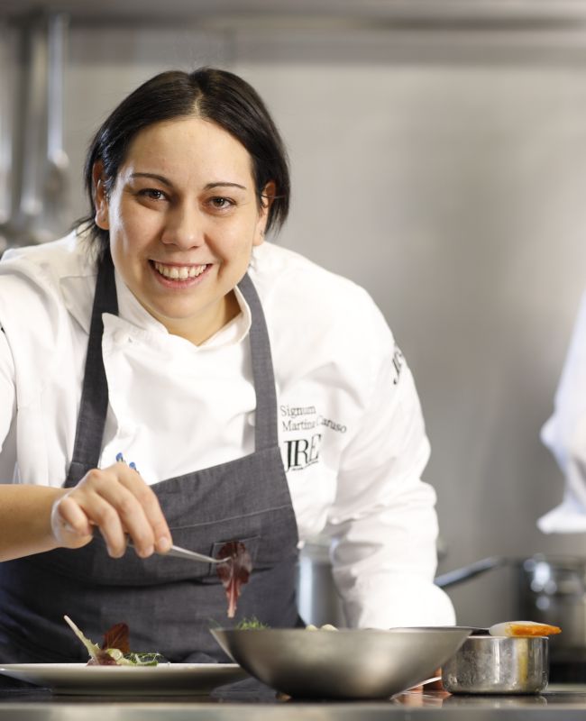 As a child, chef Martina Caruso was surrounded by the aromas of the great Italian dishes, which her father Michele Caruso, a self-taught chef, would prepare at the family restaurant, Signum. Martina decided to enroll in hotel school and to work alongside her father in the kitchen during the summer holidays. After finishing her studies, chef Martina's first work experience began in Rome with a Gambero Rosso course and a subsequent internship. Next, she joined chef Antonello Colonna at Open Colonna, then Pipero al Rex, and Aeolian to Campania under chef Gennaro Esposito. She also gained experience in kitchens abroad, first with the famous Jamie Oliver in London and then with Pedro Miguel Schiaffino in Lima, Peru. At the age of 23, together with her brother Luca, Martina takes over restaurant Signum, where she works her magic in the kitchen, and Luca takes care of the dining room and hotel management. The chef has been given many awards for her outstanding cuisine: in 2016 her entry into the Red Guide got her a coveted Michelin star. At the same time, she was honoured as the Emerging Chef of Italy by Gambero Rosso and received the Cuoca dell ' Year from Identità Golose. During the year 2019, she won Michelin’s 2019 Best Female Chef Award, which was sponsored by Veuve Clicquot's Atelier des Grandes Dames – an initiative that supports Italian cooks. Recent recognition has come from Forbes Italia, naming her among the 100 most accomplished women of 2020.