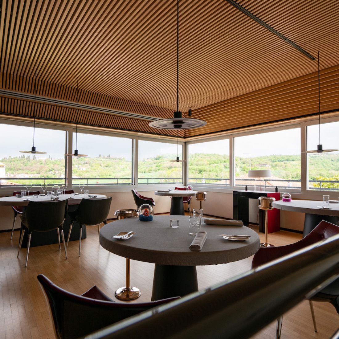 Restaurant La Peca opened in 1987 in Lonigo, near Vicenza, founded by brothers Nicola and Pierluigi Portinari. The restaurant was renovated with local architectural materials, then expanded in 2000 when the terrace became a bright dining room with large windows towards the hills and the Rocca Pisana di Lonigo. Nicola leads the kitchen. Pierluigi combines pastry with the role of patron and sommelier, shaping the experience from first course to dessert and wine. Two Michelin Stars confirm the level, but the atmosphere stays personal.
