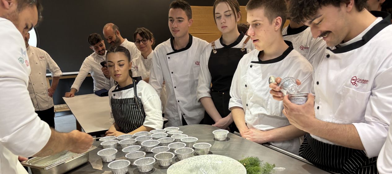 Chef Alessandro Tormolino, the visionary behind SENSI restaurant on Italy’s famed Amalfi Coast, led the first masterclass. Known for his ability to elevate authentic Italian cuisine with global influences, Chef Tormolino introduced students to his refined take on the Roman classic, cacio e pepe. His version featured a bold twist: mussels and a black garlic crumble, creating a delicate balance. Students were captivated by his ability to transform a well-known recipe into something entirely new, blending modern culinary techniques with the timeless soul of Italian cuisine.