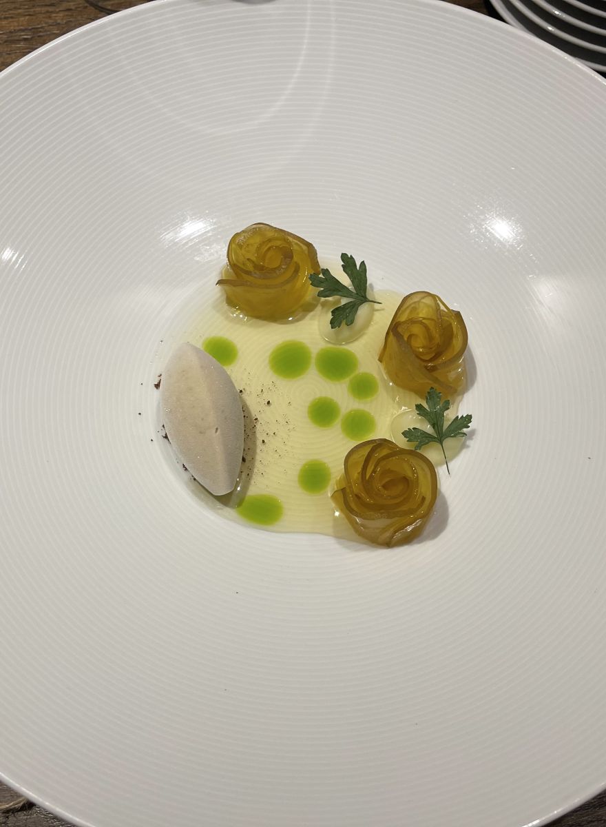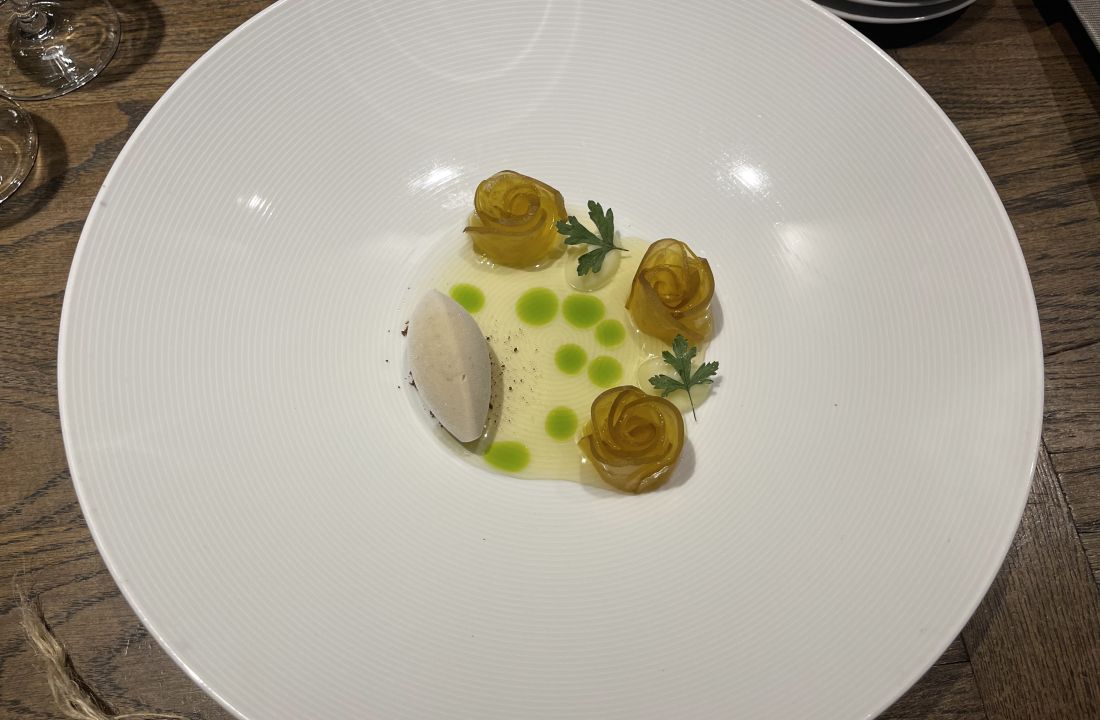 This delicate dessert pairs saffron-poached eggplant rolls with silky eggplant ice cream, uniting sweet and savory in perfect harmony. A hint of saffron adds warmth and perfume, while a crisp touch of sugared parsley brings freshness and color. Elegant, unexpected, and beautifully composed, the dish captures Chef Kalev’s artistry.