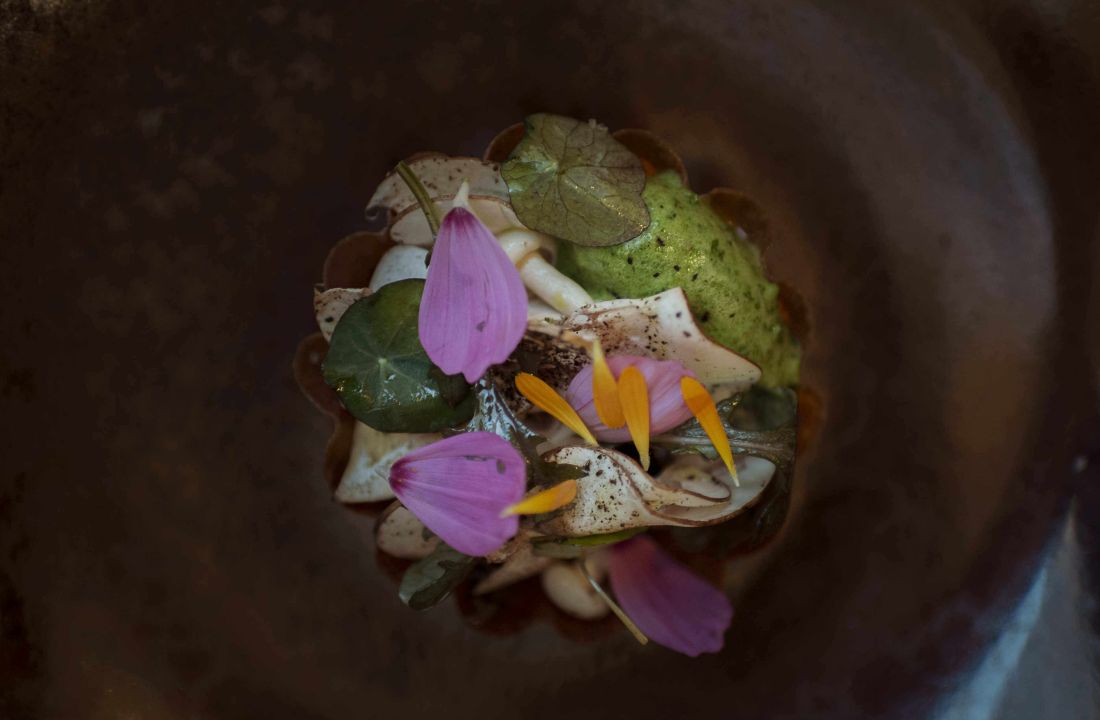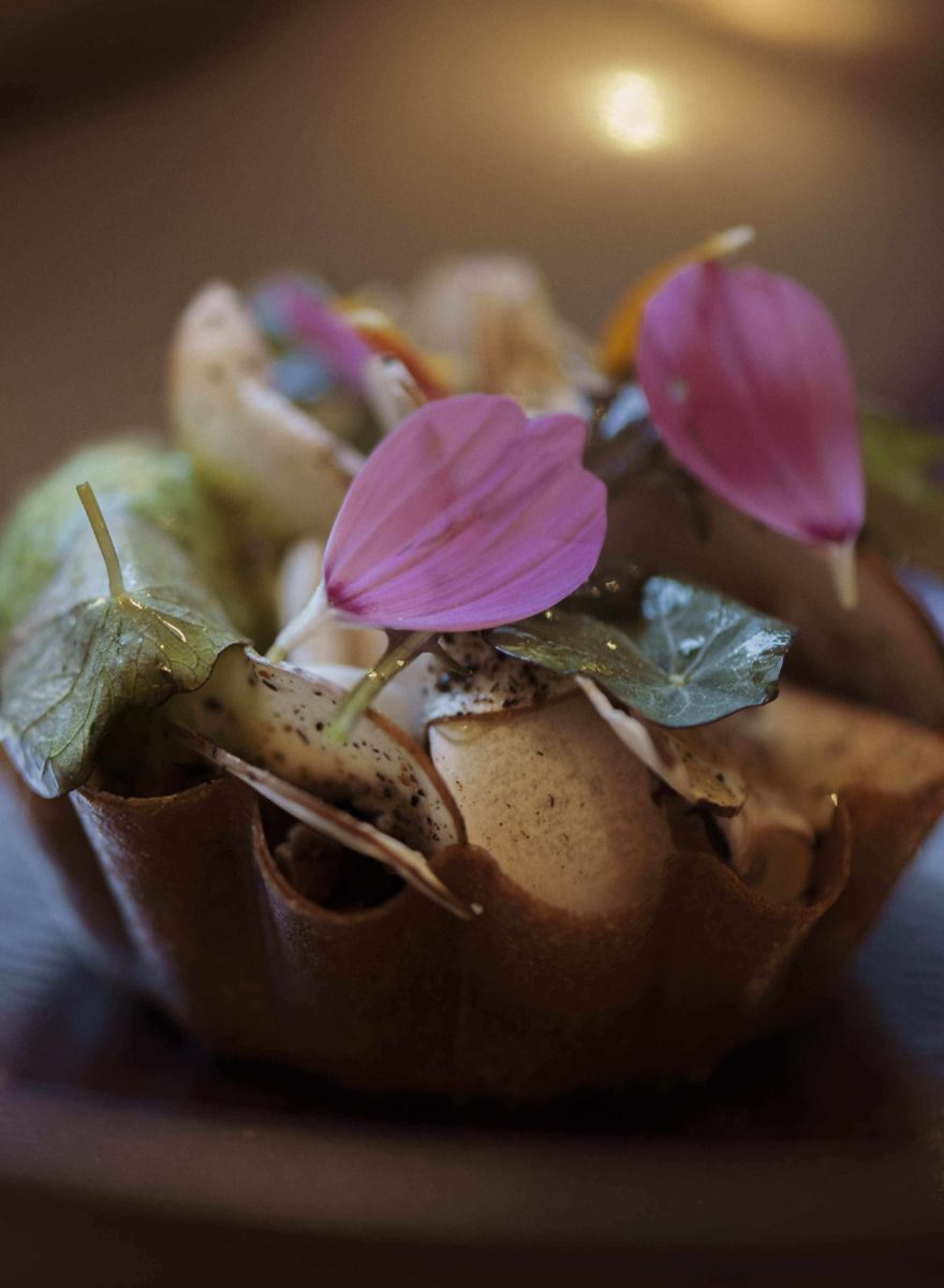 His Mushroom Tartlet with Fresh Herbs and Fir captures this philosophy in every bite. A crisp filo shell holds a silky mushroom duxelles infused with preserved lemon and butter, balanced by pickled chanterelles and shimeji. A hazelnut and fir vinaigrette adds fragrance and depth, while herbs and edible flowers bring freshness and grace. The result is an ode to the woodland: harmonious, subtle, and full of character.