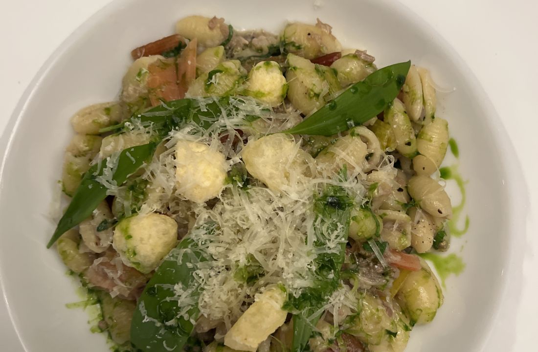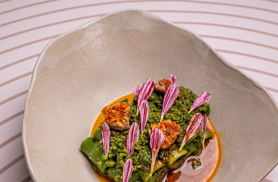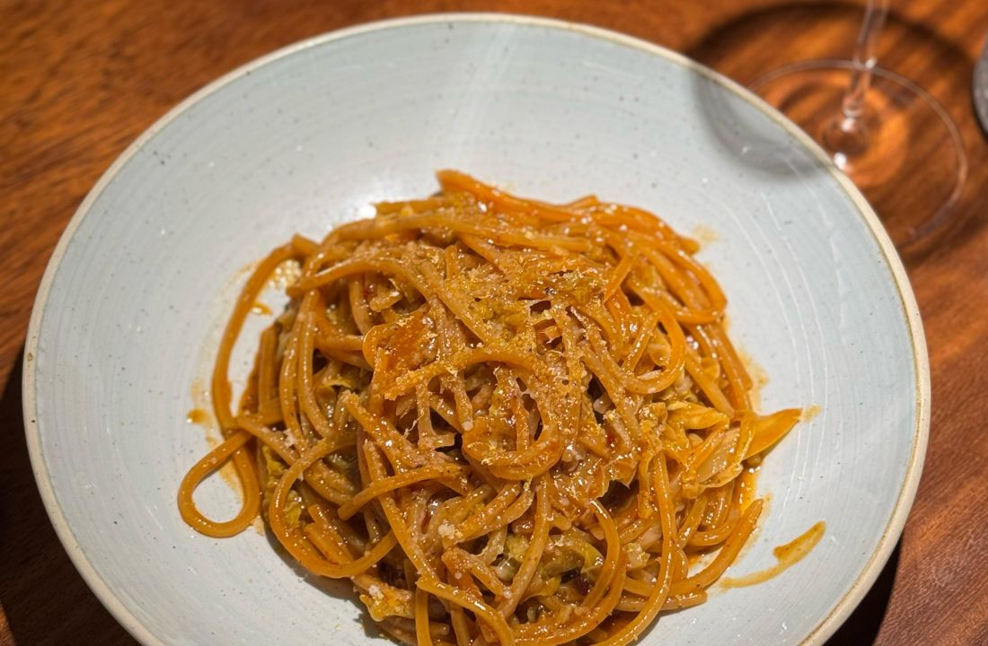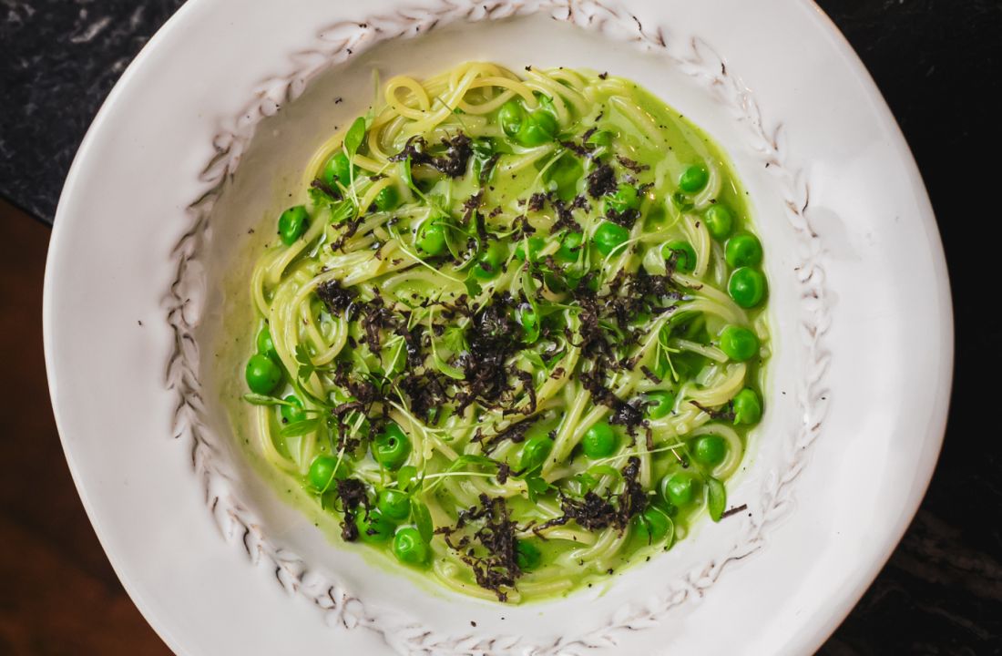 Oriental calamarata with peas, lemon, salicornia and smoked scampi