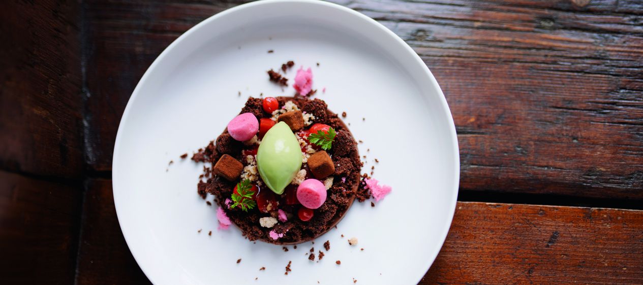 This is no ordinary chocolate mousse: it’s a symphony of deep, velvety layers and playful contrasts. A silky ganache infused with a hint of rum forms the foundation, crowned by a light, airy Zotter chocolate mousse that melts effortlessly on the tongue. Caramelized hazelnuts add a sweet, crunchy surprise, while chocolate crumble brings a rustic touch. Bright notes of pickled rhubarb, fresh strawberries, and a cool dome of chervil ice complete the experience, turning each bite into a delicate dance of richness, freshness, and subtle herbaceous flair.
