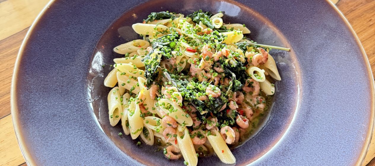 The grünkohl (Kale) will get soft quickly , once u reach this point add the fresh büsumer Krabben and let them warm in the pasta.