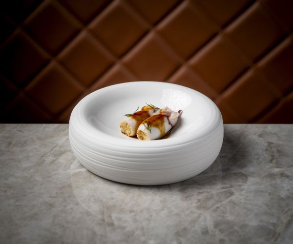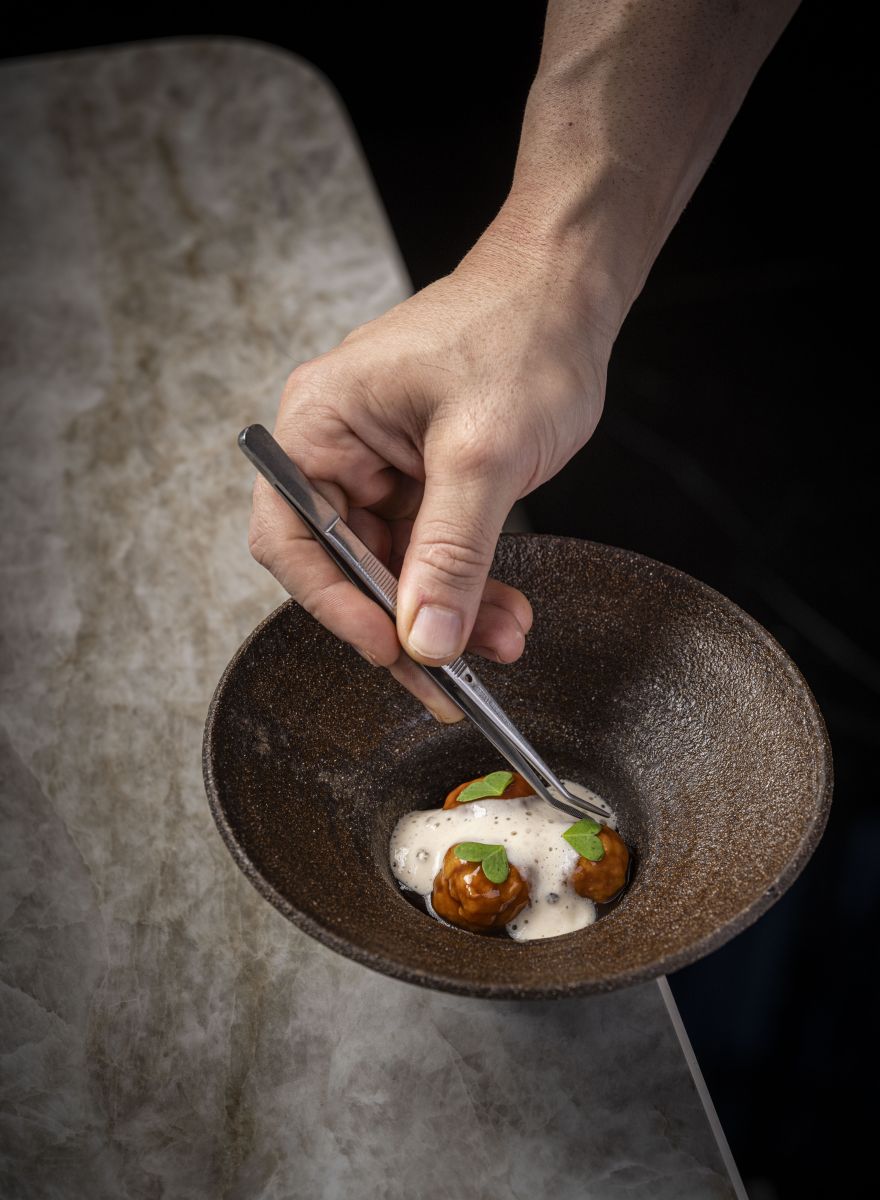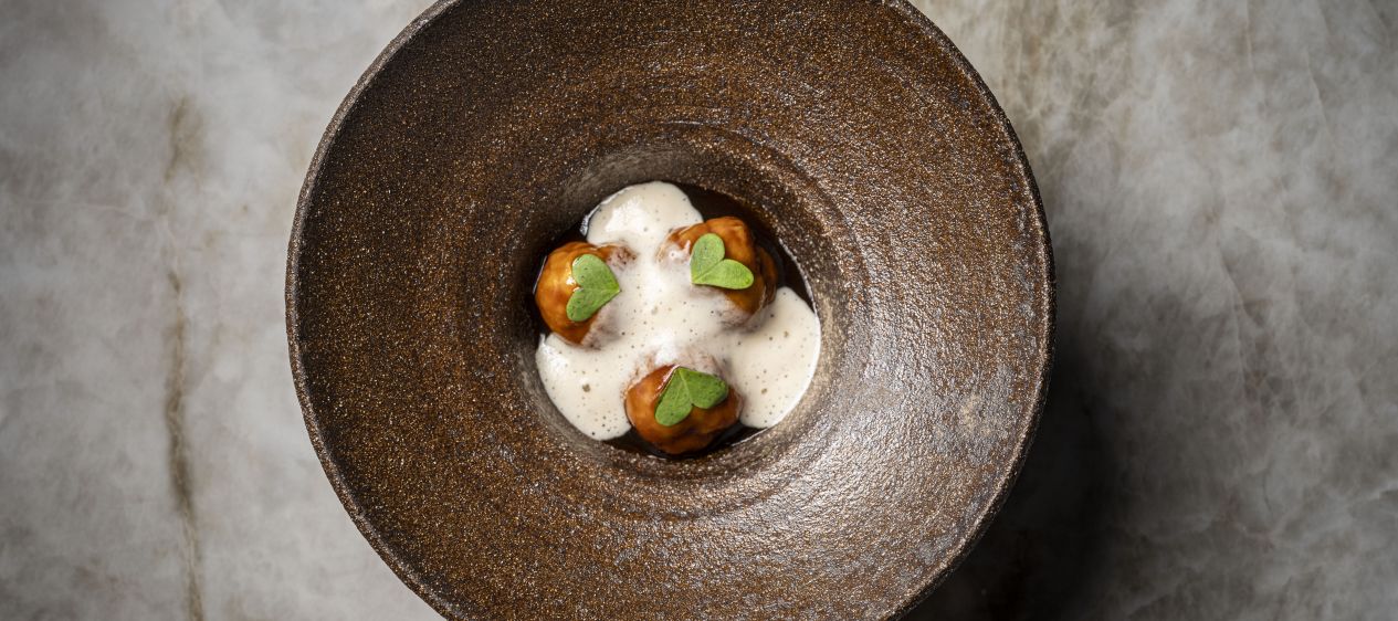 A refined interpretation of classic Mediterranean flavours, combining tender monkfish meatballs, an intense fricandó sauce enriched with mushroom and wine, and a warm foam infused with ratafia. The perfume of orange and the nuttiness of picada elevate every bite.