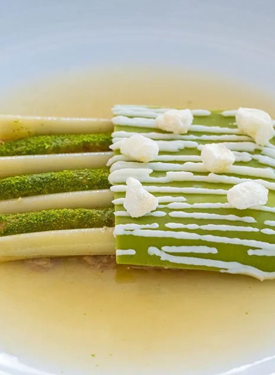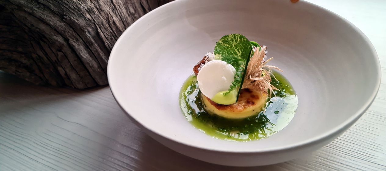Place the Flan in the middle of a bowl, put the crispy potato skin on top. Top with a lot of Parmigiano Reggiano, leek mayonnaise, chives, herbs, spring onion and the sour cream discs. Pour the sauce over the dish at serving time.