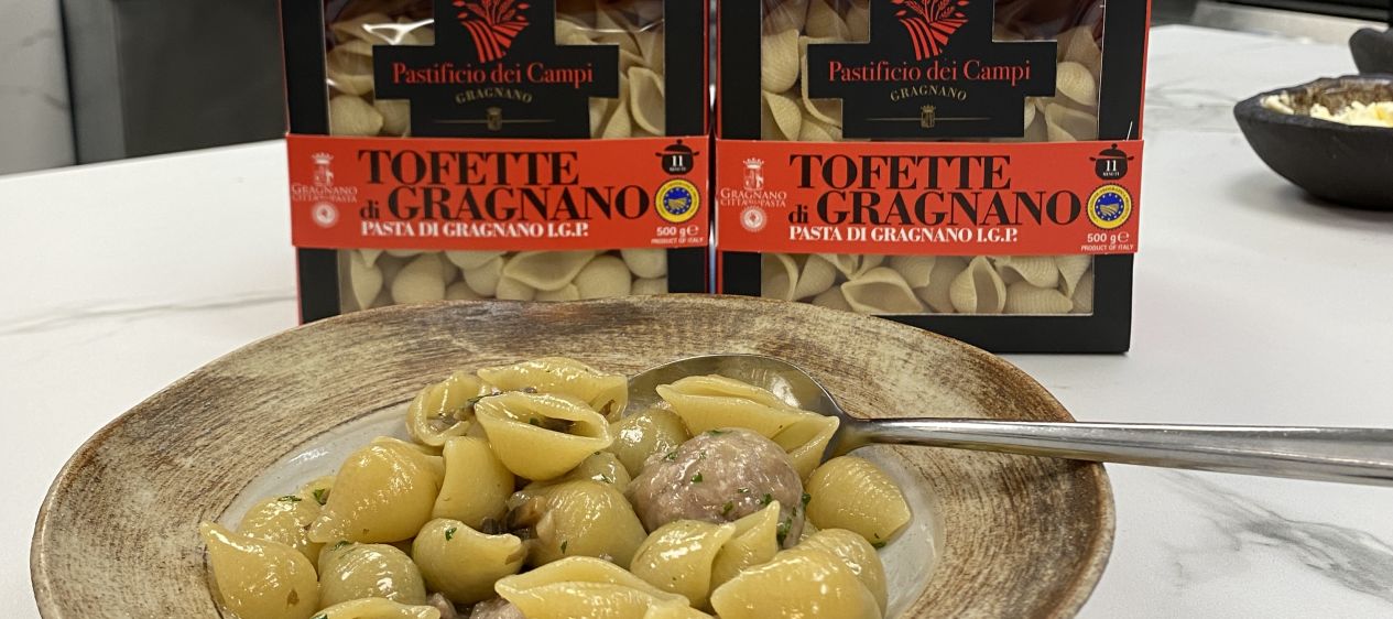 Tofette di Gragnano with mushroom duxelles and lamb meatballs