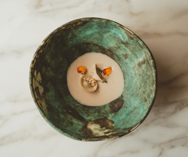 Inspired by the landscape of Valquemado, this dessert is shaped like a pinecone and hides a Parmigiano Reggiano cheesecake at its core. Pine-infused glaze and gel, enriched with broom flower honey, add aromatic intensity and connect the dish to its natural surroundings while showcasing the unexpected potential of the cheese.