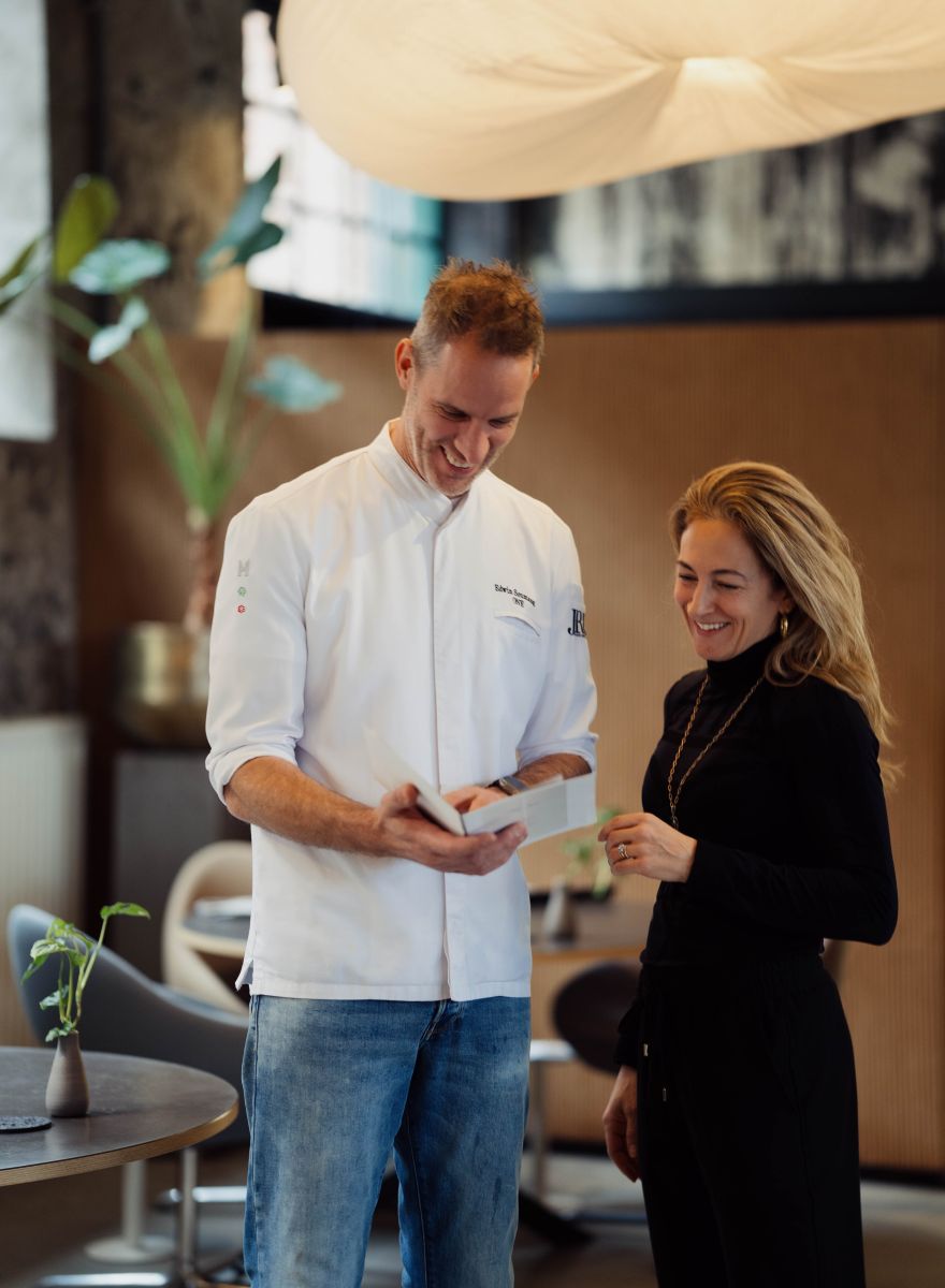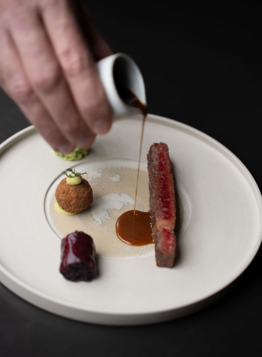 JRE-chef Edwin Soumang prepares the ribeye simply on the plancha, seasoned only with salt and pepper, allowing the true character of the meat to shine. In its current seasonal preparation, the Wagyu is served with a roll of red cabbage from the restaurant’s own garden, braised Brussels sprouts, creamy purée, and palm kale, also freshly harvested from the land. As a finishing touch, a Wagyu stew croquette is added, accompanied by a house-made jus infused with roasted rosemary.