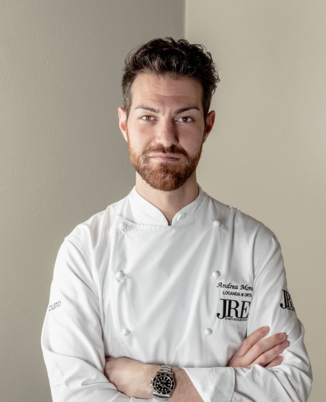 El chef Andrea Monesi nació en Novara en 1991 y desde que era un niño ha tenido un gran interés y pasión por la comida y las diferentes formas en que se pueden utilizar los ingredientes. En la cocina de su familia, observó a sus padres cocinar y decidió allí mismo que esa sería la carrera que seguiría. Después de graduarse, tuvo la suerte de trabajar junto a varios chefs muy respetados, como Marta Grassi y Matteo Vigotti, y aprendió muchas técnicas que sigue utilizando hoy en día. En 2012 comenzó a trabajar en Locanda di Orta con Sara Orlando y en 2019 empezó a dirigir el restaurante él mismo y trabajó duro para asegurar que su personalidad, pasión y compromiso con la comida de calidad estuvieran presentes en cada aspecto de la experiencia gastronómica. En 2018, Andrea fue galardonado con una estrella Michelin como reconocimiento a la versatilidad de su menú y a su duro trabajo y dedicación.