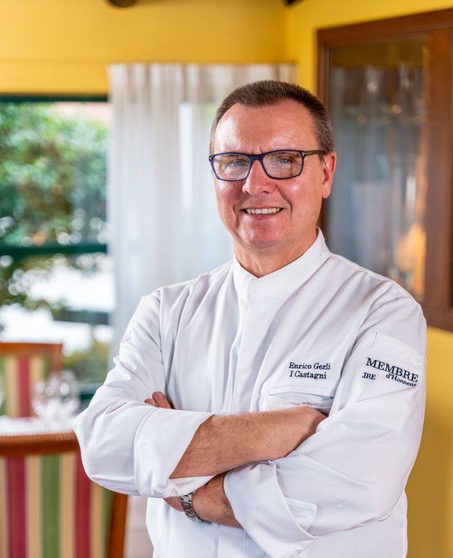 "El chef Enrico Gerli dirige I Castagni desde 1989, transformando una casa de campo familiar en el campo de Vigevano en un destino gastronómico con estrella Michelin. Autodidacta, con diploma de sumiller y una profunda pasión por el oficio, desarrolló su estilo a través de la intuición, la disciplina y posteriormente experiencias en cocinas con estrella. Su cocina está profundamente arraigada en Lombardía y guiada por el sabor, la precisión y una clara preferencia por la calidad sobre la complejidad. El pescado ocupa un lugar refinado en el menú, junto a platos clásicos locales preparados con seguridad y elegancia."