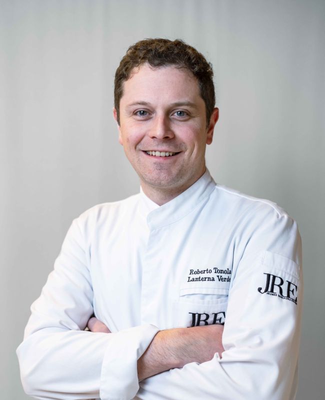 Para el chef Roberto Tonola, la cocina es una pasión que se ha transmitido de generación en generación, una verdadera historia familiar. Hijo del chef Antonio Tonola, a Roberto le gusta experimentar con nuevas creaciones basadas en productos locales. Por ejemplo, los huevos de las gallinas salvajes que vagan libremente por el bosque, las castañas y las setas recogidas en los bosques, y la caza salvaje de las zonas de caza cercanas. La excelente cocina del chef Roberto presenta platos tradicionales remasterizados con gusto, junto con una curiosidad innata y habilidad técnica con los ingredientes disponibles en el cambio de las estaciones. Roberto representa la tercera generación en Lanterna Verde, y es el único miembro de la segunda generación de la JRE.