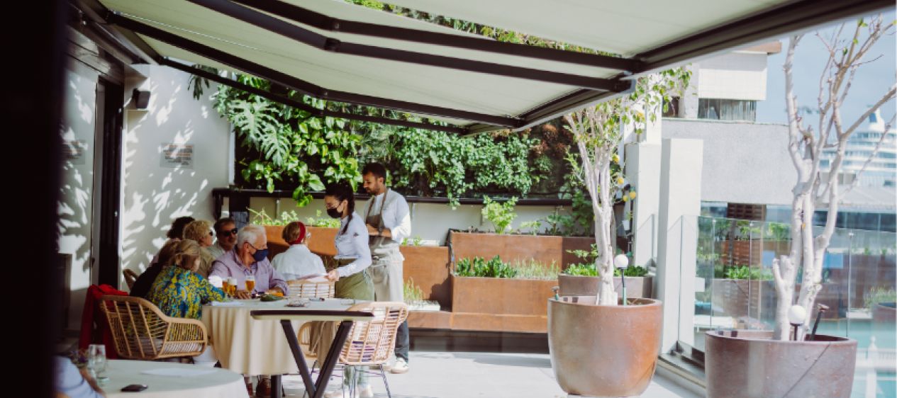 El restaurante 100% sostenible está en la azotea del hotel Catalina Plaza Sostenible, junto al Parque Santa Catalina y el mar de fondo.
