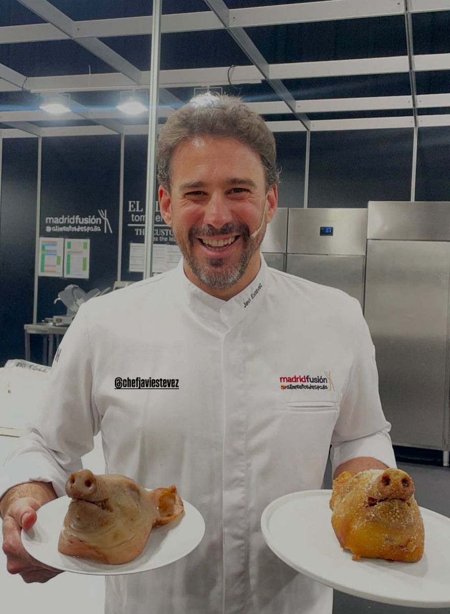 En Madrid Fusión 2026, el chef Javi Estévez, de La Tasquería en Madrid, participó en una presentación organizada por Makro, en la que explicó su forma de trabajar la cabeza de cochinillo y sus distintas elaboraciones.