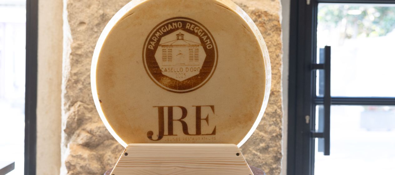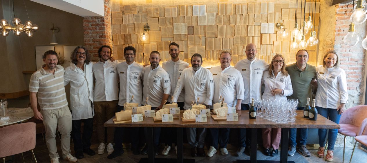 Los chefs Manuel Franco (La Casa de Manolo Franco, España); Borja Marrero Vázquez (MuXgo, España); Seve Díaz (El Taller de Seve Díaz, España); Deborah Corsi (La Perla del Mare, Italia); Luca Marchini (Erba del Re, Italia); Massimiliano Mascia (San Domenico, Italia); Iris Bettinger (Reuter, Alemania); Thomas Gruber (Seespitz, Austria) y Yann Tournier (La Pomme D’Or, Francia), miembros de JRE–Jeunes Restaurateurs, la asociación que reúne a algunos de los talentos más influyentes de la alta gastronomía europea, recibieron una pieza de 20 kilos de Parmigiano Reggiano galardonado. Con ella, se les encomendó la tarea de crear una receta original que pusiera en valor la complejidad de este queso, elaborado en las provincias de Parma, Reggio Emilia, Módena, Mantua y Bolonia.