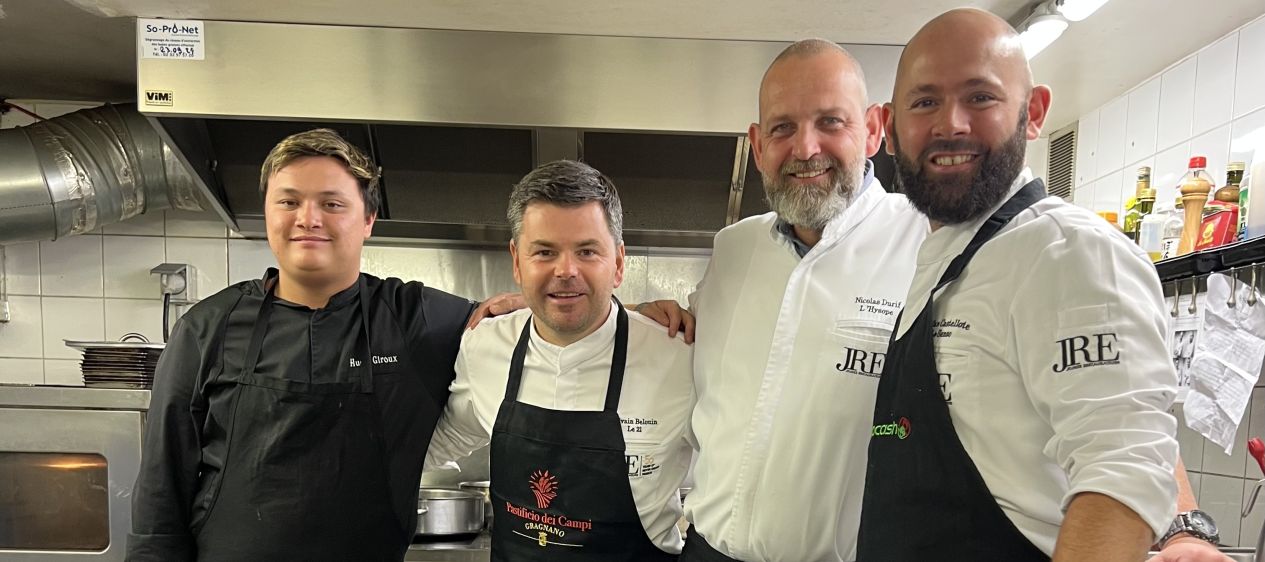 Quelle magnifique soirée a été vécue par 60 convives le dimanche 6 octobre dernier ! Réunis autour de nos chefs Allan Castellote, Sylvain Belouin, Nicolas Durif et Hugo Giroux, les invités ont pu savourer des plats audacieux et délicieux, accompagnés par les succulents champagnes de notre partenaire Champagne de Vignerons et les vins d’exception de notre partenaire les vins IGP Pays d’Oc, dont les accords ont ravi nos fins gourmets.