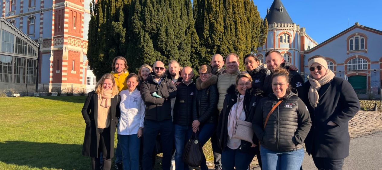 Un groupe de membres JRE-France a été invité par la Maison Pommery à visiter le Domaine, avec notamment une visite privée et spectaculaire des caves renommées de cette maison, mais aussi une masterclass dégustation de 4 cuvées prestigieuses et un déjeuner dans leur restaurant, « le réfectoire ». Les caves mondialement renommées comprennent 18 km de galeries souterraines, à 30 mètres sous la terre. Ce sont des anciennes carrières de craie utilisées par les gallo-romains, qui ont été réutilisées par Madame Pommery pour faire vieillir le vin dès 1836. Pommery est connue pour être la première maison à inventer et commercialiser un champagne brut en 1874, une cuvée dont on peut retrouver une bouteille dans les caves, au milieu d’autres millésimes rares et très anciens. Mais surtout ce qui est exceptionnel, c’est cet amour de l’art contemporain qui a toujours été une signature de la maison. Dès qu’on descend l’escalier de 116 marches, on découvre une multitude d’œuvres d’art impressionnantes dans les galeries, inscrites au patrimoine mondial de l'UNESCO. Après la visite des caves, nous avons pu déguster le Brut Royal, l’Apanage blanc de blanc, l’Apanage blanc de noir et la Cuvée Louise 2005. Nous avons ensuite tous déjeuné dans le restaurant du domaine, et terminé par de belles photos sous le soleil de Reims.
