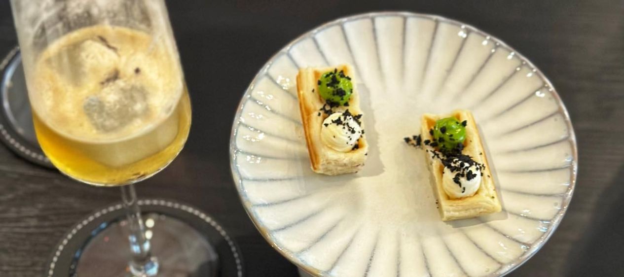 Nous avons pris le menu inspiration en 6 services. Il existe des menus en 4 et 5 services ainsi qu’un menu végétarien. J’ai opté pour l’accord vin qui accompagner mon menu, mais sachez qu’il existe aussi une formule sans alcool. À la table d’à côté une femme à pris cela et j’entendais qu’elle était agréablement surprises par ce qu’on lui proposait. Ainsi vous êtes au courant de cette belle proposition. En apéro pour accompagner les mises en bouche j’ai pris en suggestion le cocktail du moment à base de Gin , Sirop de pomme, Jus de pomme & Siphon de thé. C’était la première fois que j’avais dans un cocktail une technique de siphon c’était vraiment très intéressant.