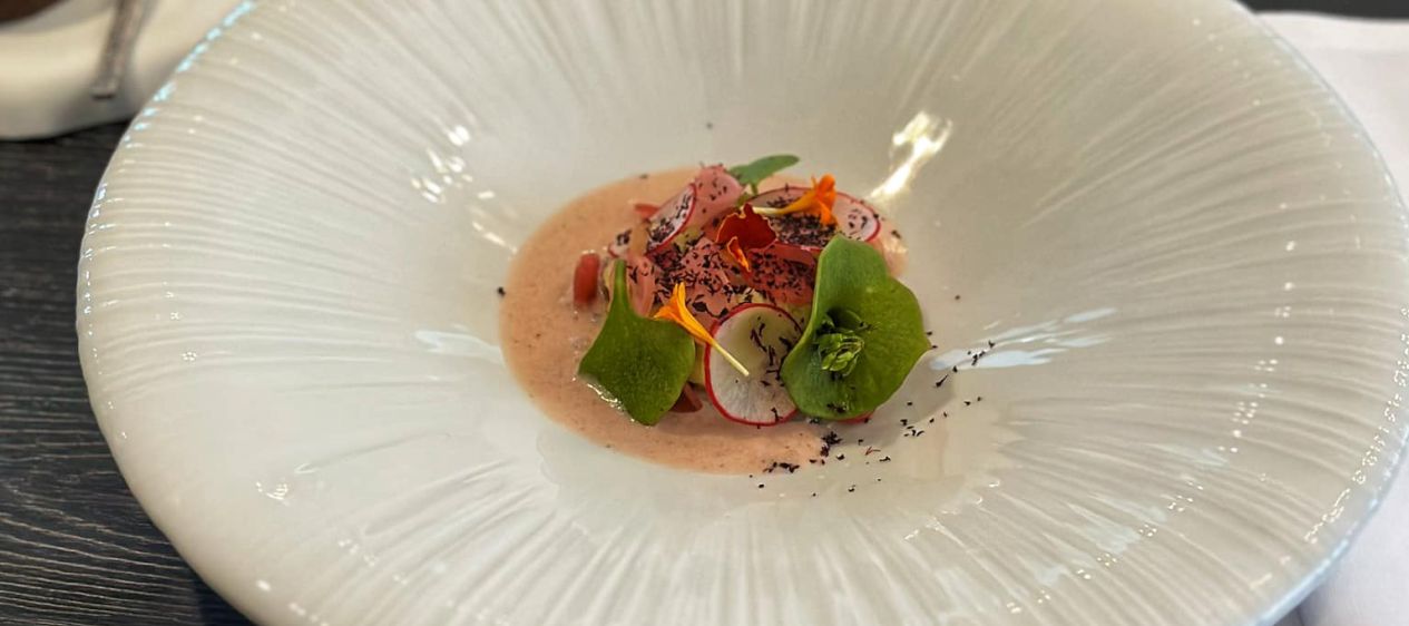 Tartare de dorade ( Houmous à la Claytone de Cuba / Radis lacto-fermenté /Furikake Rouge )