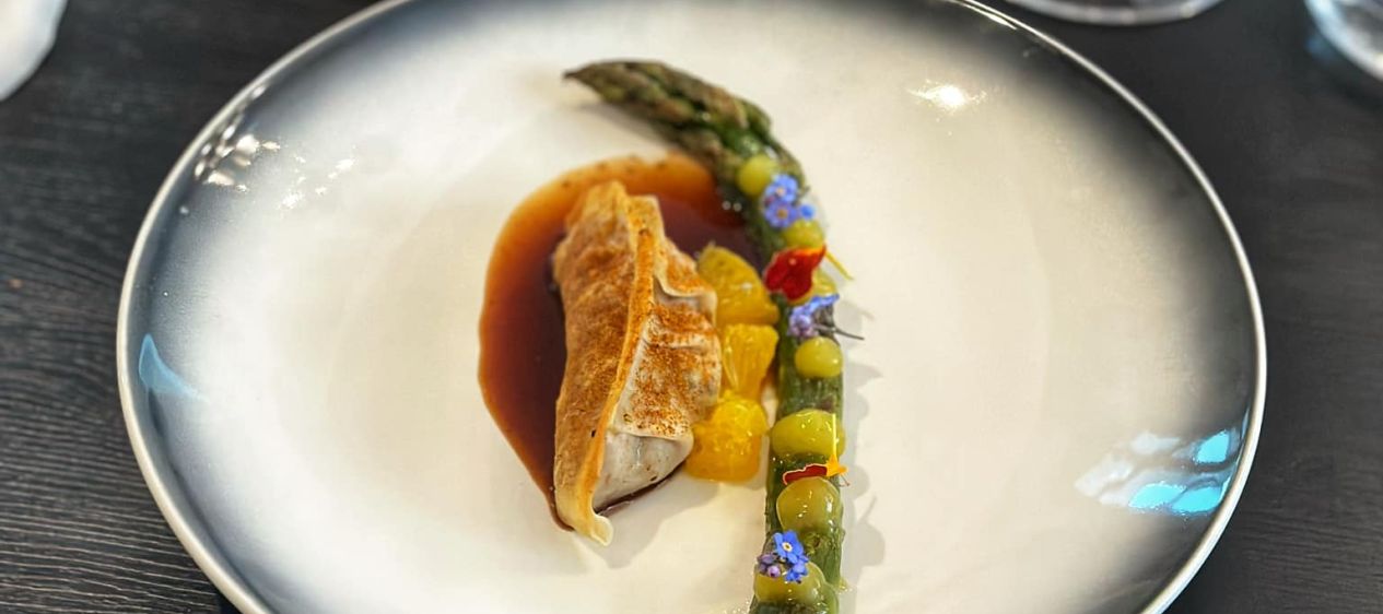 Raviole de souris d'agneau confite au miel d'argousier ( Dattes Medjoul / Asperges vertes / Jus à la fleur d'oranger )