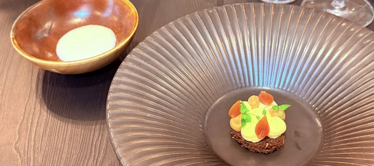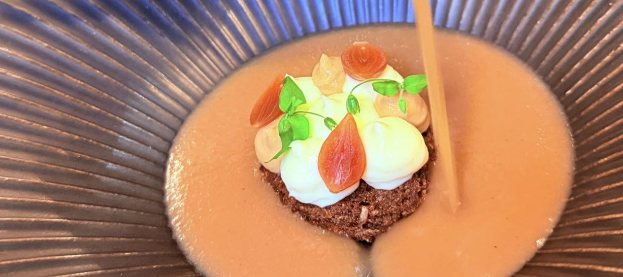 Un petit bol contenant une mousse de Gruyère AOP sur lequel on vient verser un consommé d’oignons froid. Ensuite un Feuilleté torsadé garni de confiture d’oignons, crèmes, oignons confits, pétales etc, à croquer tout du long. Enfin la grande assiette avec un croûton de pain noir, quelques points de crèmes et confiture d’oignons et ensuite une vraie soupe à l’oignon chaude qu’on vient verser autour. On commence par le froid afin de laisser le temps à la soupe d’imbiber le croûton de pain dans l’assiette principale.