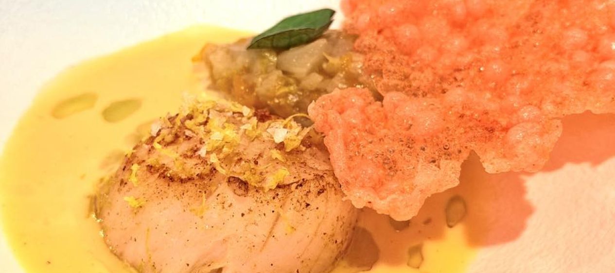 Saint-Jacques en 2 actes : une partie froide dans la coquille, tartare de St-Jacques coupée épaisse, avec chicons confits froids et une mousse façon « chicon au gratin » par-dessus. C’était bon mais la mousse brune dominait un peu la St-Jacques. Au contraire, dans la préparation chaude, la St-Jacques, dont la cuisson était parfaite, dominait l’assiette et était très harmonieusement accompagnée de Chicon, Clémentine et d’un jus épais du Corail, très gourmand.