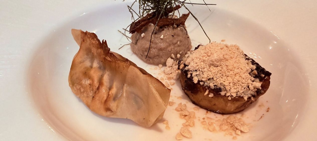 On reprend le menu avec un Gyoza d'Anguille fumé & Foie gras poêlé, accompagné de consommé de Boeuf au Kombu et de champignons Eryngii. Les différents éléments étaient fort bons, dont une poudre glacée de foie gras que j’ai eu la bonne idée de goûter avant que le reste ne tombe dans le consommé de bœuf fort puissant qui dominait l’assiette. Mais comme parfois dans le sexe, cette dominance était bien agréable !