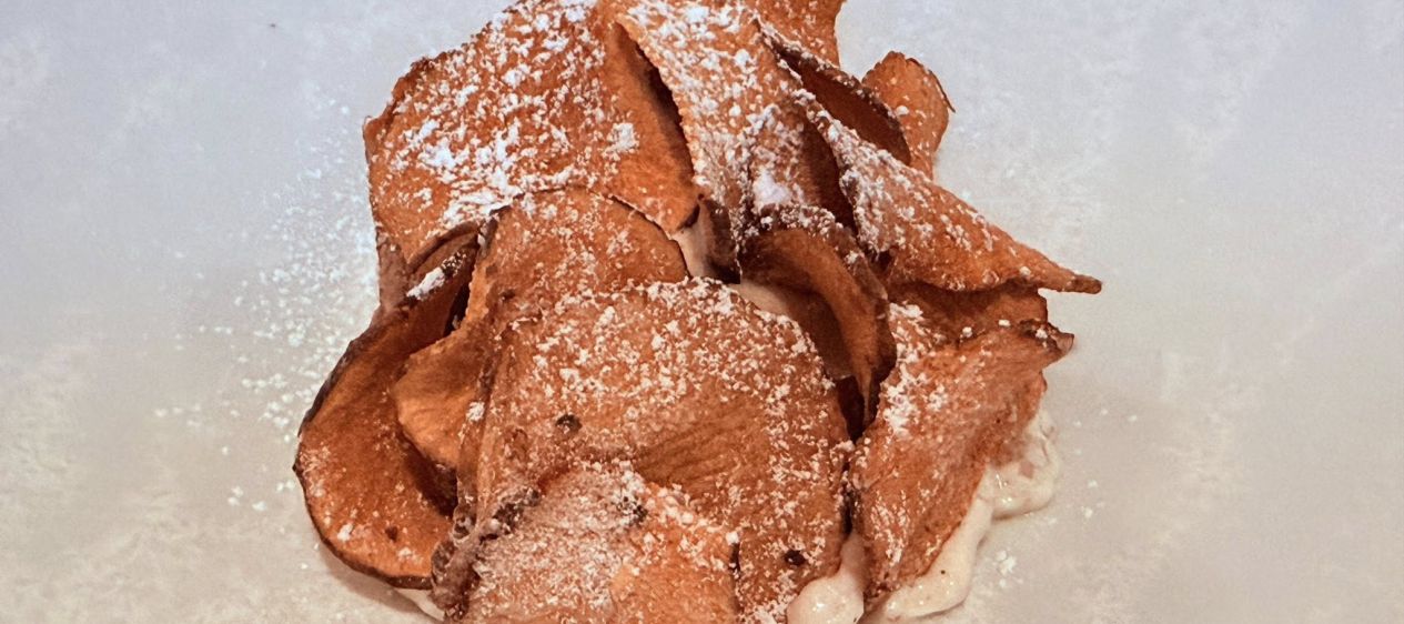 Enfin donc, Riz au lait de Topinambours avec Confiture de lait, Noisette et Citron. Le topinambour est donc concassé en petits morceaux de la taille d’un grain d’orge et travaillé en cuisson comme un riz au lait. A mi-cuisson, 30% de riz est ajouté, et la cuisson de finit ensemble. Différentes crèmes tièdes et glacées aussi sont ajoutés, et finalement l’ensemble est recouvert d’une carapace de chips de topinambours croquants.
