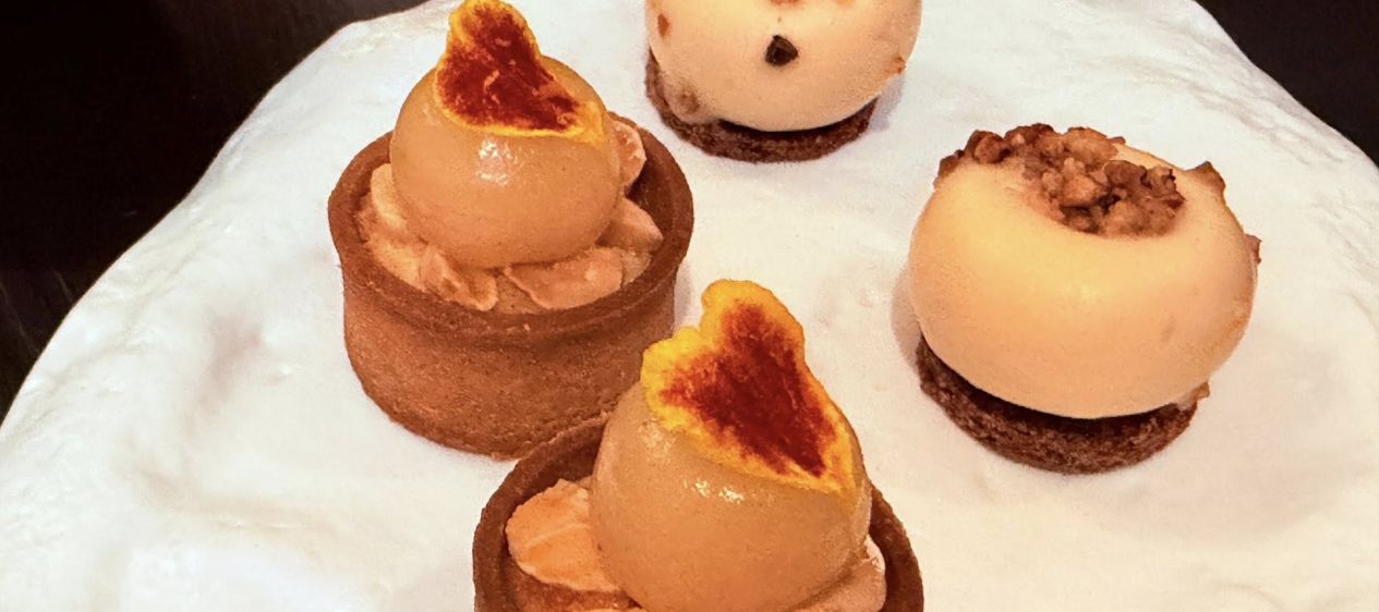 Les mises en bouche arrivent. Deux pièces puis deux autres. Toutes sous forme de bouchées ou petites tartelettes à gober en une fois, dont la mise en bouche « signature » du chef, la praline au boudin noir. Tout était plein de goût et fort bon.
