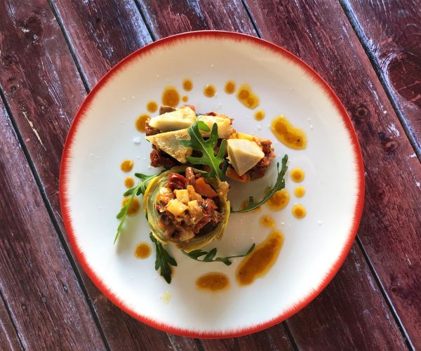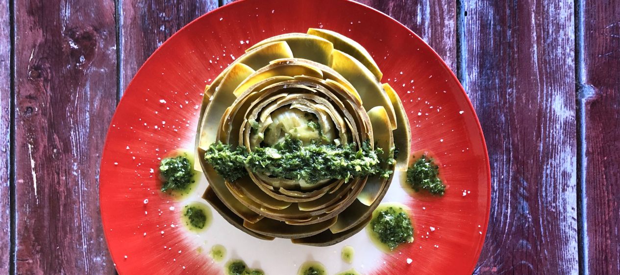 Poser l’artichaut sur l’assiette et verser le beurre d’herbes dessus.