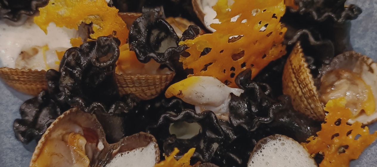Dans une assiette creuse disposer les Gigli di Gragnano.Disposer les coques entières ainsi que les noix de coque.Disposer les morceaux de tuile en parcimonie.Émulsionner avec un mixeur plongeant la préparation a base d'ail, jusqu'à obtenir une écume légère.Disposer délicatement a l'aide d'une cuillère l’écumes dans l'assiette.