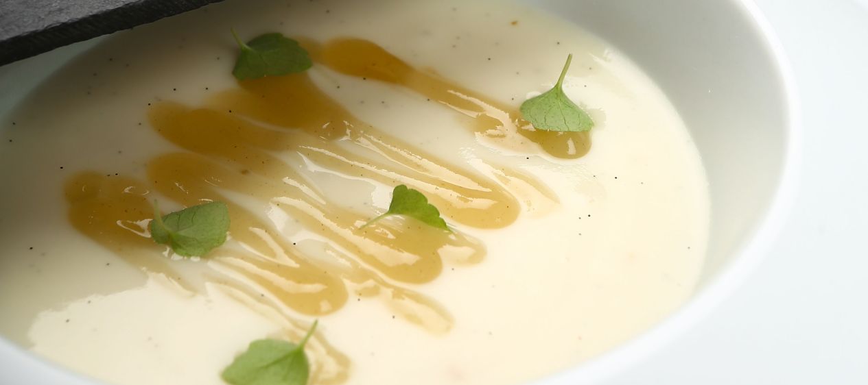 Recouvrir le fond de l’assiette avec la brunoise de poires crues et le panais cuit. Ajouter également une brunoise de poire tapée. Recouvrir de velouté de panais et faire quelques points de gel de poire. Ajouter les herbes.