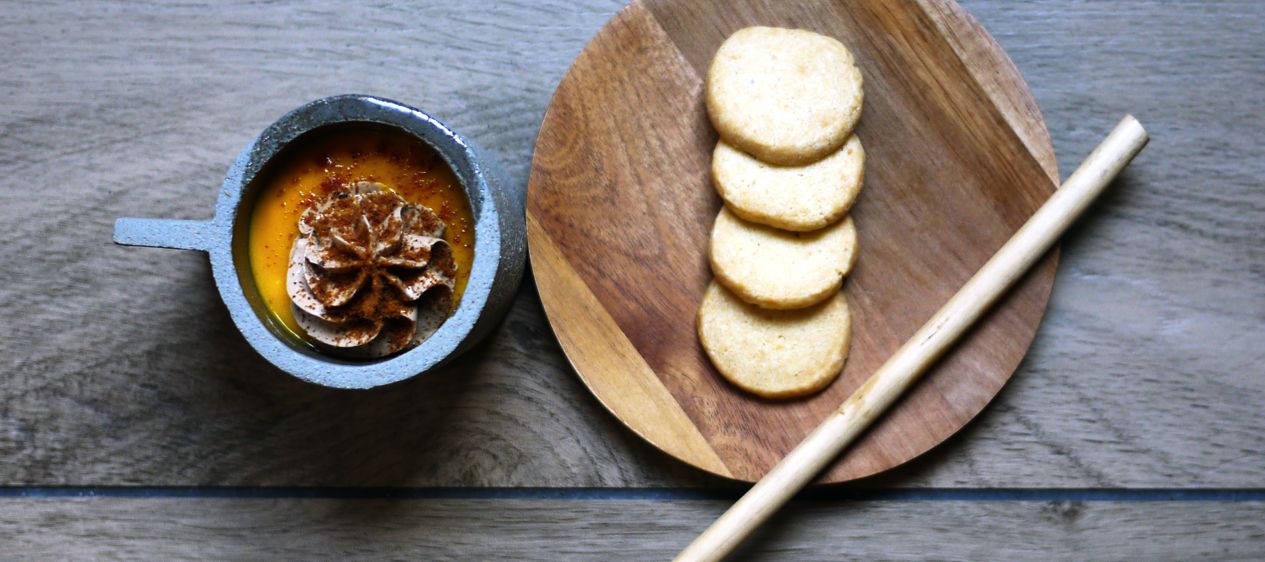 VELOUTÉ DE POTIRON « HUBBARD BABY BLUE » À L’HUILE DE NOISETTES ET PAIN D’ÉPICES, CRÈME MONTÉE À L’AIL NOIR